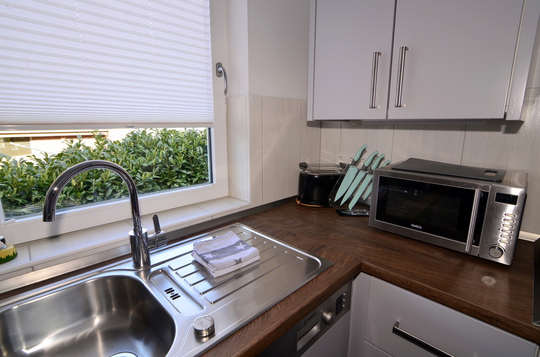 - Küche: Voll ausgestattete Küche mit Herd, Backofen, Kühlschrank, Mikrowelle, Kaffeemaschine und Geschirrspüler